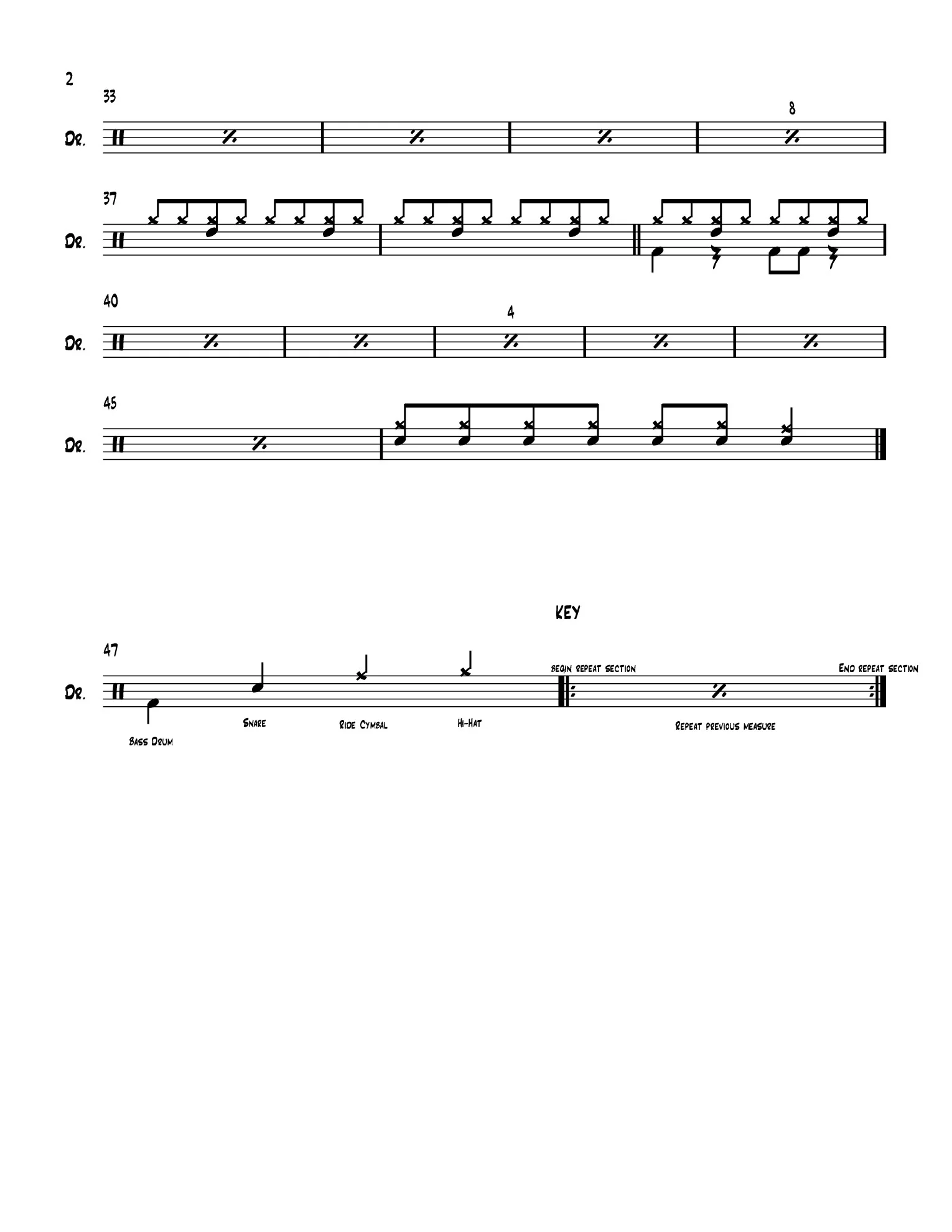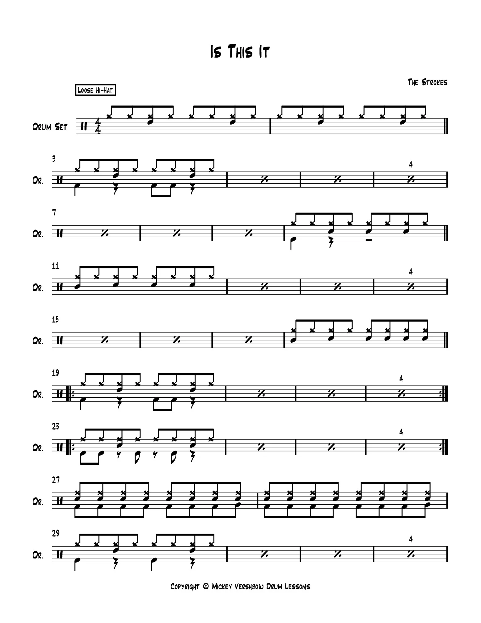 This song is a great way for beginning students to start applying beats and fills in the context of a song. The chart is written out note for note, so you can read your way through until you start to memorize the song structure. Keep an eye out for section repeats, as well as the right hand moving between the hi-hats and the ride cymbal.